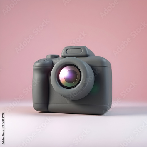 A minimalist digital camera with a matte gray design and a striking lens, placed on a white surface against a soft pink background. Modern and futuristic appearance.