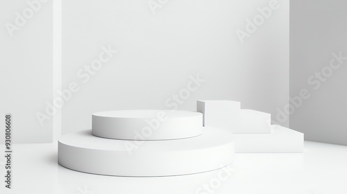 A minimalist display featuring circular and rectangular podiums in a white space.
