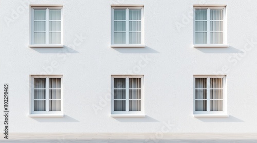 A minimalist exterior featuring four symmetrical windows on a white wall, emphasizing simplicity and modern design.