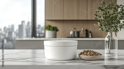 A minimalist food container styled on a smooth marble countertop with branding space. pic