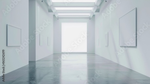 A minimalist gallery hallway with blank picture frames on the wall. Sunlight streams in from a large window at the end of the hall.