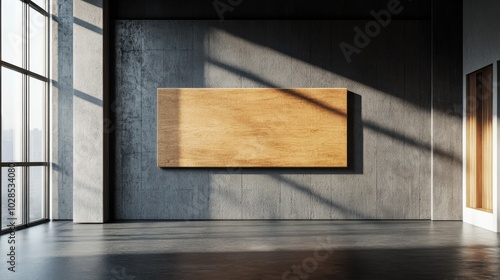 A minimalist gallery showcasing a large wooden panel against a concrete wall.