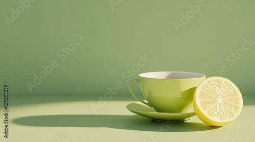 A minimalist green cup sits beside a lemon slice, casting soft shadows on a matching green backdrop.