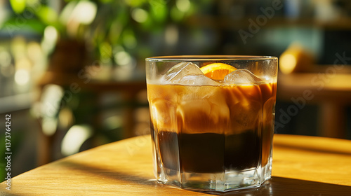 A minimalist high-end product photography shot of a ice bumble coffee (Bumblebee coffee). Orange coffee, tonic, coffee lemonade