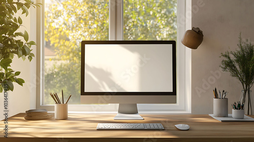 A minimalist home office desk with a computer, keyboard, and mouse with a blank screen, pencils, books, and plants in front of a window.