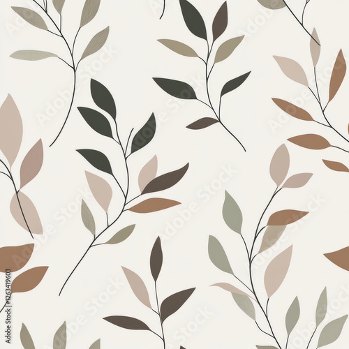A minimalist illustration with delicate, finely outlined leaves in soft neutral tones like beige, taupe, and muted green. The design evokes a sense of calm, perfect for subtle, modern home decor.