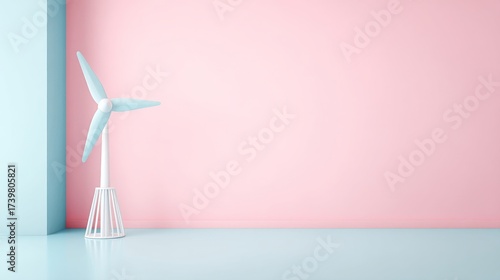 A minimalist indoor scene features a small wind turbine model against a two-tone wall with pastel pink and light blue,