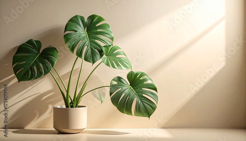 A minimalist indoor scene featuring a healthy monstera plant in a neutral pot, bathed in natural sunlight creating elegant shadows on a light beige wall.