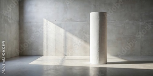 A minimalist interior design featuring a cylindrical column in a spacious room with concrete walls and natural sunlight streaming through unseen windows creating dramatic shadows on the floor
