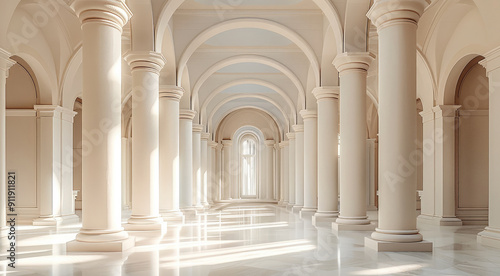 A minimalist interior design with a cream color palette, featuring tall columns and arches, the large and open space creates an elegant. Generative AI.