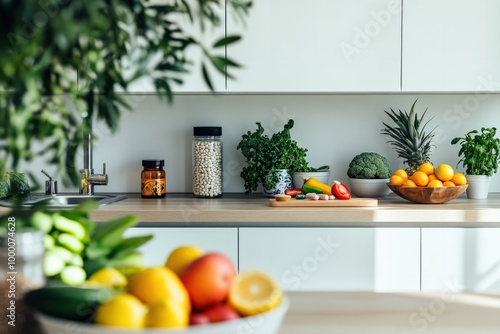 A minimalist kitchen scene showcasing organic supplements like vitamin C, omega-3, and probiotics, alongside fresh fruits and vegetables, promoting a natural wellness routine
