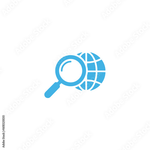 A minimalist light blue icon of a magnifying glass positioned over a stylized gridded globe, symbolizing global search and discovery.