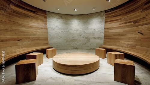 A minimalist, light-filled interior space features a large circular wooden table surrounded by simple wooden seating.