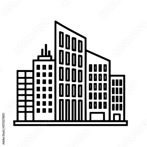 A minimalist line drawing of a city skyline featuring several modern skyscrapers with rectangular windows.