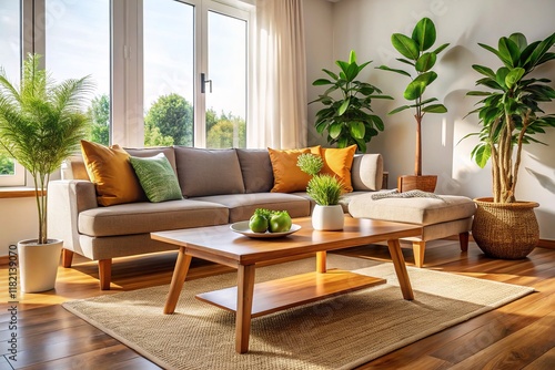 A minimalist living room, featuring a low coffee table and lush plant décor.