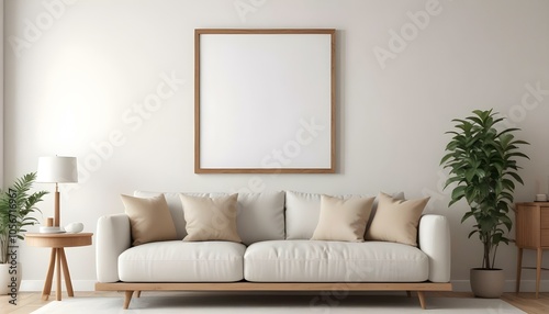 A minimalist living room with a white sofa, beige throw pillows, and a wooden frame on the wall