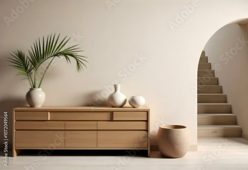 A minimalist living room with a wooden sideboard, decorative vases, and a potted plant on the wall.