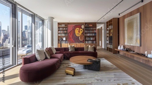 A minimalist living room with warm wooden floors and a deep burgundy sectional sofa complemented by cream and gold cushions A round wooden coffee table and a stylish area rug ancho