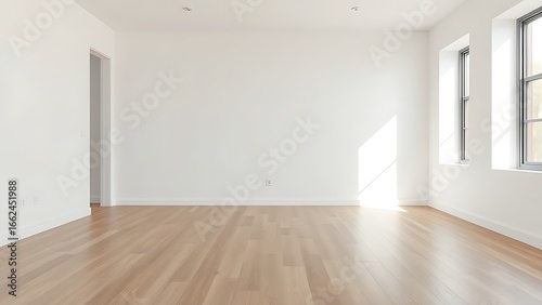 A minimalist living space featuring empty wooden floors and white walls in natural ambient light.