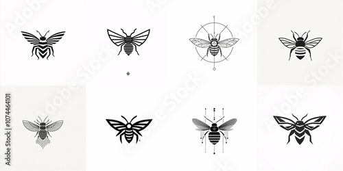 A minimalist logo collection featuring a stylized bee with geometric wings and stripes in a monochromatic design on a white background.