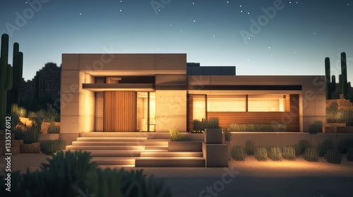 A minimalist modern house in the desert, featuring a concrete and wood exterior with a large illuminated front door