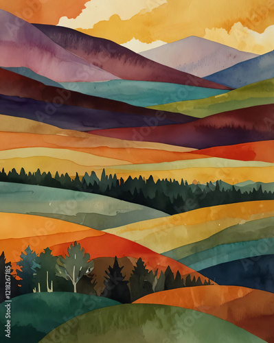 A minimalist mountain illustration with a large sun in the background.