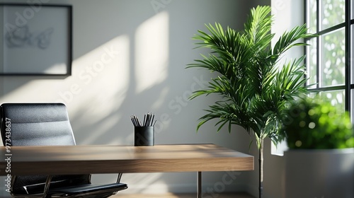 A minimalist office space with a sleek wooden desk, ergonomic chair, and a large indoor plant by the window