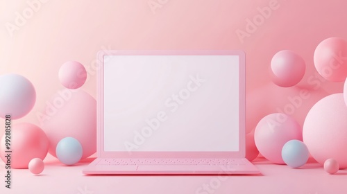 A minimalist pink laptop surrounded by soft, colorful spheres on a pastel background.