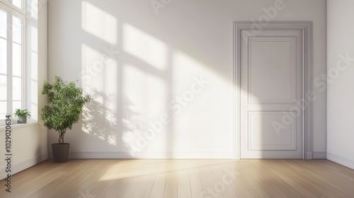 A minimalist room with a potted plant, white walls, and wooden floors bathed in sunlight.