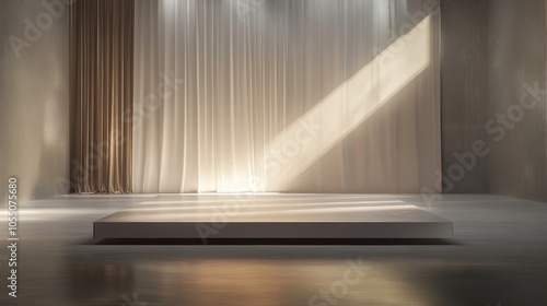 A Minimalist Room with a White Platform and Sunlight Streaming Through Sheer Curtains