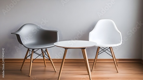 A minimalist room with light gray walls, wooden flooring, and an armchair placed near the wall. A coffee table stands between them, on which there is one white chair. The background of the scene