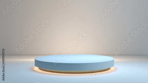 A minimalist round display stage in pale blue with warm beige highlights, smooth finish, placed on a bright white seamless surface under soft lighting. .