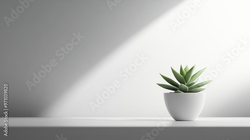 A minimalist setting featuring a succulent plant in a white pot, illuminated by soft light.