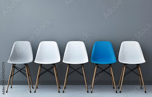 A minimalist setup featuring five stylish chairs against a gray wall, perfect for interior design and home decor inspiration.