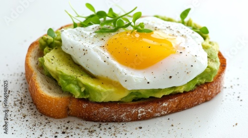 A minimalist shot of a slice of toasted bread with a layer of creamy avocado and poached egg on top, garnished with microgreens, set against a light background.