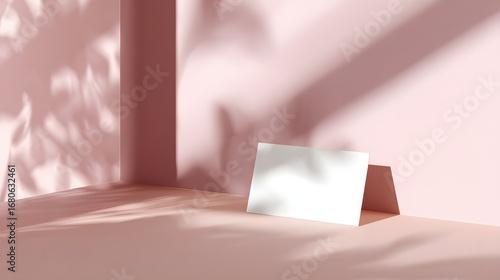 A minimalist, soft pink presentation space showcases a blank business card mockup, bathed in diffused sunlight casting elegant shadows from foliage.