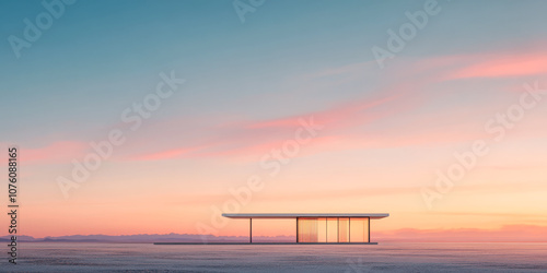 A minimalist structure stands alone against a vivid sunset in a serene landscape at dusk