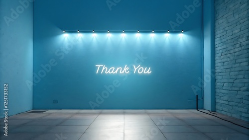 A minimalist "Thank You" message in clear, elegant lettering, glowing against a serene blue background with radiant light shining down from above