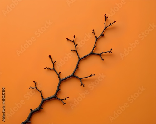 A minimalist top-down view of a single bare branch with small red buds, placed diagonally on a vibrant, solid orange background.