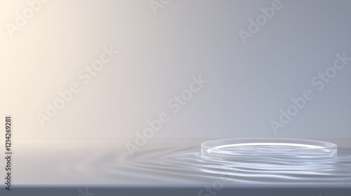 A minimalist transparent stand floating above rippled water, illuminated by a radiant glowing circle, creating a serene atmosphere.