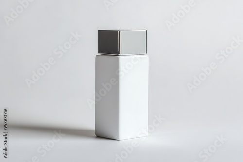 A minimalist white bottle with a metallic cap, likely for cosmetics or fragrance.