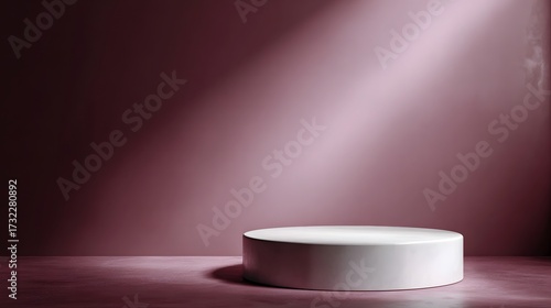 A minimalist white cylinder podium illuminated by a dramatic spotlight against a deep mauve background