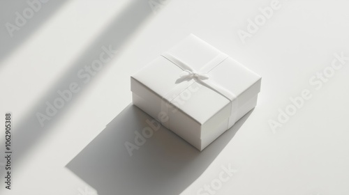 A minimalist white gift box with subtle shadows, perfectly centered on a clean white surface