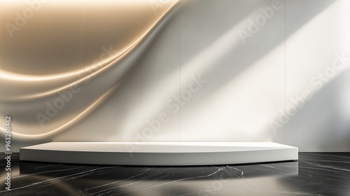 A minimalist white platform positioned in front of smooth, curved luxury walls with soft, ambient lighting casting gentle highlights and shadows across the space with shiny marble black floor.
