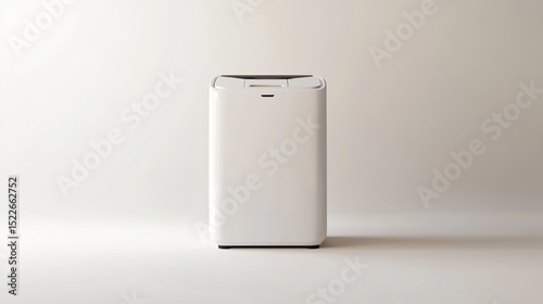 A minimalist, white, rectangular dehumidifier stands on a light-grey surface against a subtly brighter background, showcasing its clean, modern design