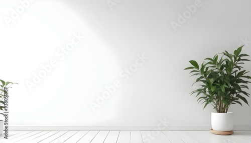 A minimalist white room with a wooden floor and a potted plant in the corner.