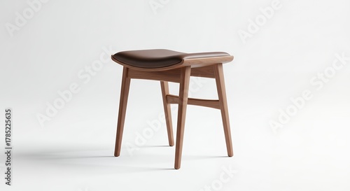 A minimalist wooden stool with a curved brown upholstered seat isolated on a clean white background.