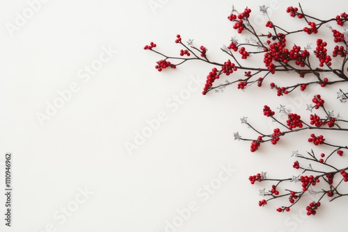 A minimalistic arrangement showcases vibrant red berries delicately placed against a pristine white background, embodying simplicity and elegance in nature’s artistry.