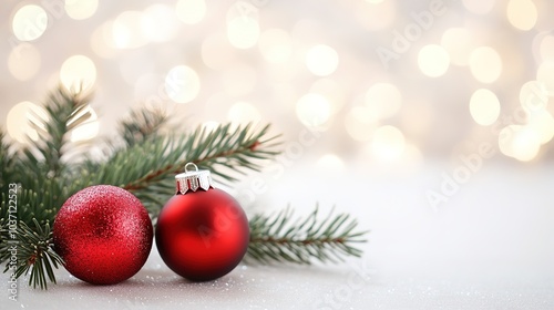 A minimalistic Christmas and New Year scene featuring a soft bokeh background that creates a dreamy atmosphere. On the left side, a lush spruce branch elegantly lies next to colorful Christmas balls,