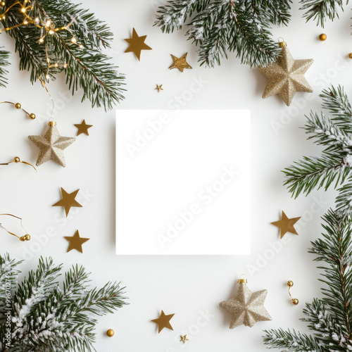 A minimalistic holiday-themed arrangement featuring a blank black square surrounded by festive greenery and gold stars.